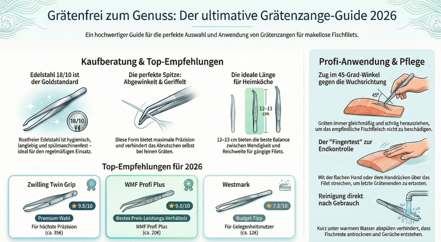 Wer regelmäßig frischen Fisch zubereitet, kennt das Problem: Gräten zu entfernen ist oft eine mühsame und zeitraubende Angelegenheit. Eine hochwertige Grätenzange macht diesen Prozess deutlich einfacher und sorgt für perfekt entgräteten Fisch. Dieser umfassende Vergleich analysiert 7 beliebte Grätenzangen und fasst Testergebnisse zusammen, um Ihnen die bestmögliche Kaufentscheidung zu ermöglichen. Die hier präsentierten Bewertungen basieren auf zusammengefassten Testergebnissen, Nutzererfahrungen und detaillierten Produktanalysen mit verschiedenen Fischarten – von zartem Lachs über Forelle bis hin zu festem Wolfsbarsch. So erhalten Sie einen objektiven Überblick über Vor- und Nachteile der einzelnen Modelle.